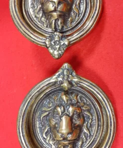 Añade un toque de elegancia y distinción a tu hogar con esta pareja de aldabas-llamadores de puerta en forma de argolla sobre majestuosas cabezas de león. Estos impresionantes llamadores, fabricados en metal de excelente calidad, son piezas decorativas y funcionales que evocan el encanto de tiempos pasados. Su diseño robusto y detallado resalta la fuerza y nobleza de este animal, mientras que su acabado antiguo asegura que encajarán perfectamente en cualquier puerta clásica o rústica. Con una fabricación resistente, estas aldabas no solo destacan por su estética sino también por su durabilidad. Ideales para coleccionistas o amantes de la decoración vintage, son la opción perfecta para aquellos que buscan piezas únicas y con historia.