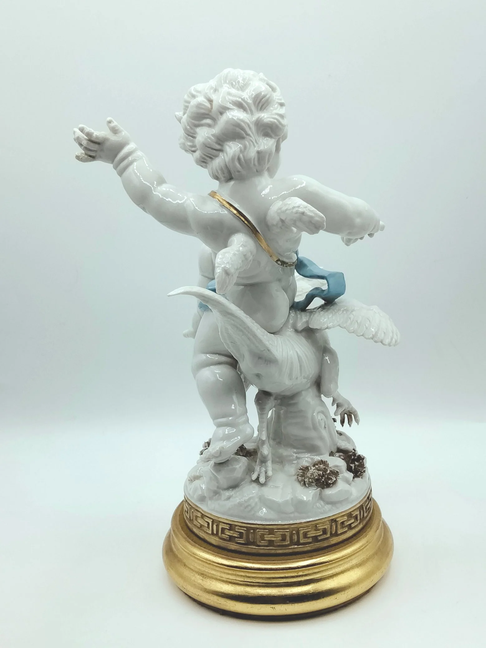 ¡Descubre la elegancia y el encanto de nuestra figura exclusiva de un ángel cabalgando sobre un faisán! Esta pieza única, combina la delicadeza celestial del ángel con la majestuosidad exótica del faisán, todo sobre una elegante peana dorada que añade un toque de lujo a cualquier espacio.