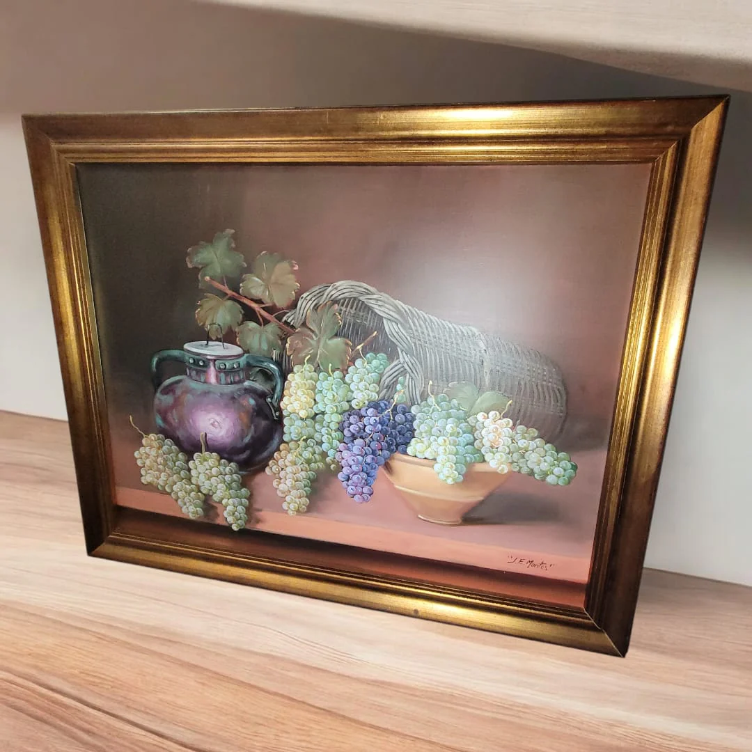 Este espectacular bodegón pintado al óleo, firmado por el reconocido artista JE Montes , es una pieza única que destaca por su realismo y exquisita técnica. La obra retrata una composición clásica con un jarrón de reflejos metálicos, un cesto de mimbre y racimos de uvas en tonos verdes y morados, logrando una combinación de colores cálidos que transmite serenidad y elegancia.