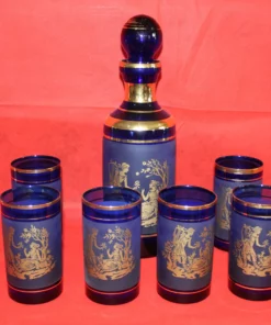 Este impresionante set de botella y vasos está elaborado en cristal cobalto de gran calidad, decorado con elegantes detalles en oro. La botella mide 32 cm de altura y los vasos, 12 cm, lo que lo convierte en el complemento perfecto para cualquier mesa o colección.