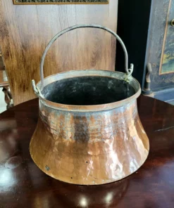 Este antiguo caldero de cobre es una joya artesanal ideal para añadir un toque vintage y rústico a cualquier espacio. Con una sola asa resistente y fabricado a mano, este caldero tiene una historia que se refleja en su autenticidad y detalles únicos. Su tamaño generoso de 49 x 20.5 cm lo convierte en la pieza perfecta para centros de flores o como un elemento decorativo en tu hogar.